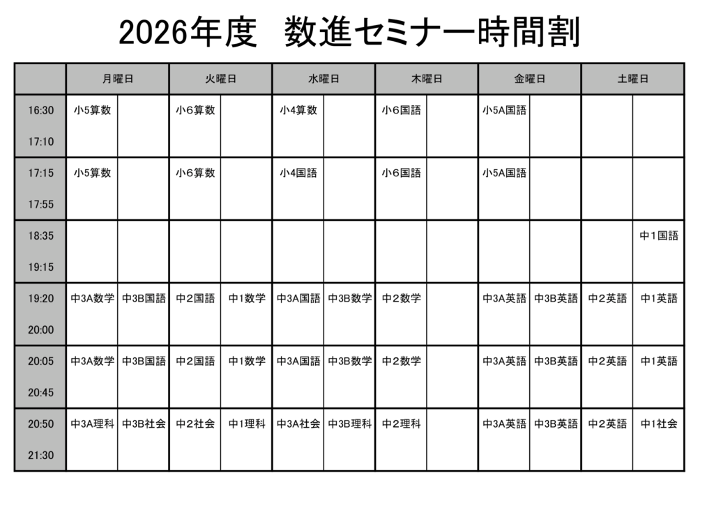時間割は次の通りです。ご確認ください。